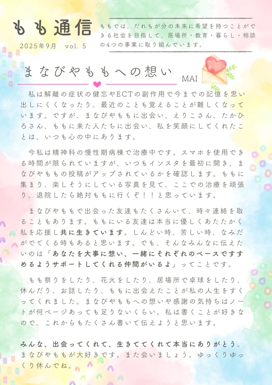 2025.9.26 #こども・若者の声#もも通信 ユース新聞:もも通信特別号VOL.5 今回のユース新聞「もも通信特別号」では、当団体に通ってくれていたある方が、今の思いを綴ってくれました。こうして言葉を届けてくださったことに、心から感謝します。 PDFはこちら